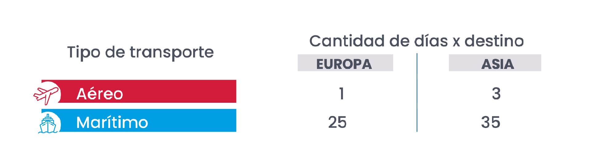 Los envíos marítimos ya no se han realizado en este año. Un factor clave es el requerimiento rápido de los clientes internacionales y el tiempo de vida útil de la pitahaya. Aquí una gráfica de lo que significa en días el transporte marítimo y aéreo: